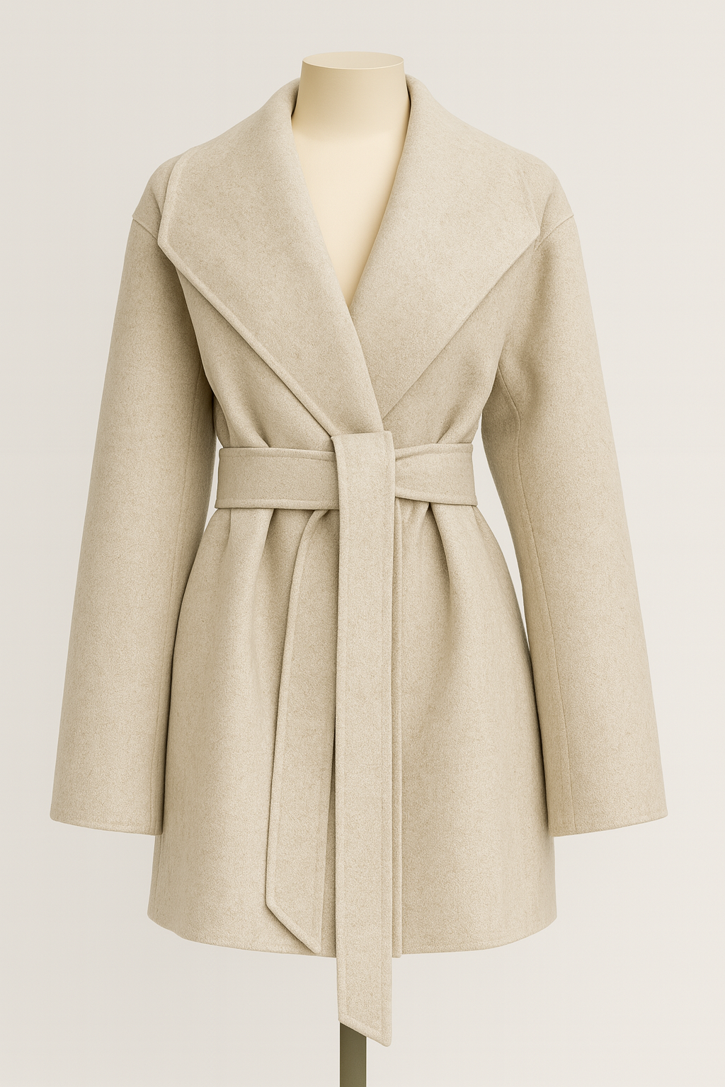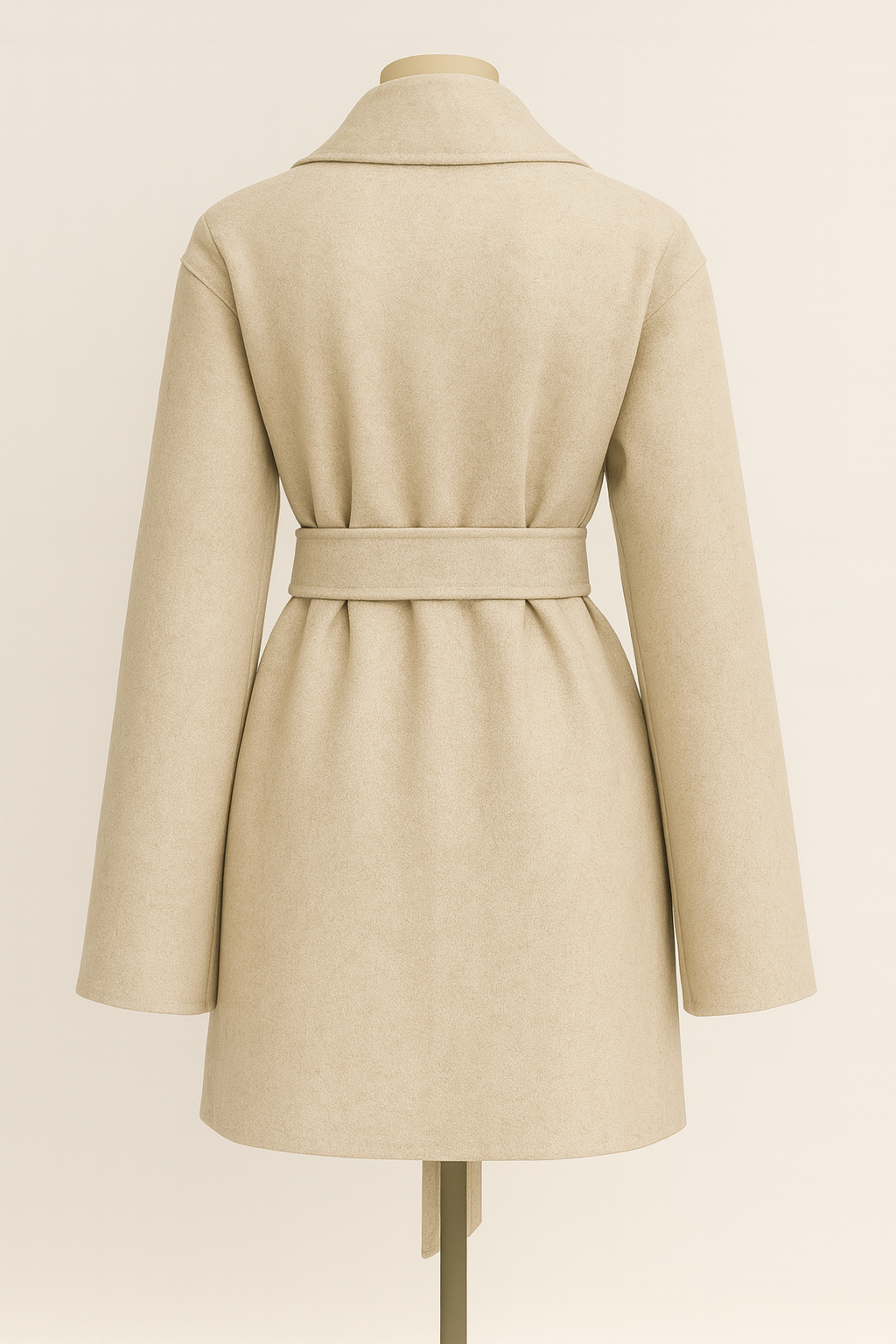Almond Drift embodies warmth and minimal elegance. Its creamy beige tone recalls the smoothness of almond shells, while the flowing lines and wide lapels add a sense of quiet sophistication. The belted waist creates gentle structure, balancing comfort with refinement. With its clean, versatile silhouette, this coat drapes like a soft layer of nature’s calm—perfect for both casual outings and polished city looks.