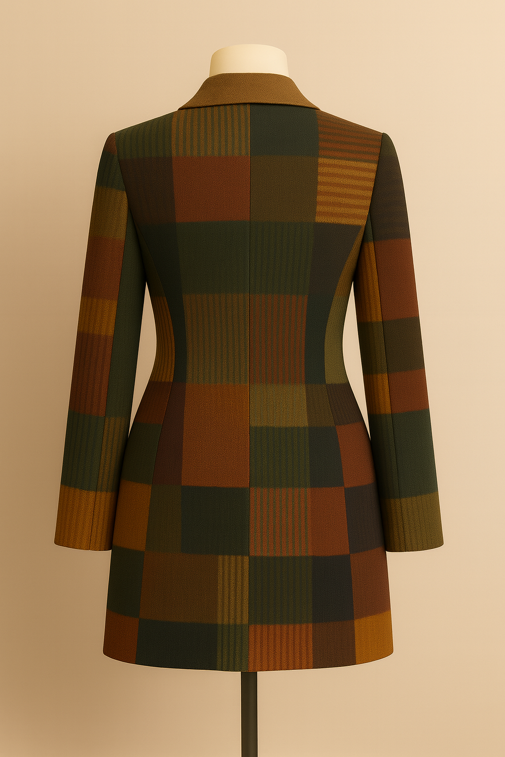 This enchanting dress blends rustic charm with tailored elegance, showcasing a mosaic of autumnal plaid in textured ribbed fabric. The structured lapels and fitted waist create a flattering hourglass shape, while the subtle flare at the hem adds feminine flow. Ideal for seasonal transitions, it exudes cozy sophistication.