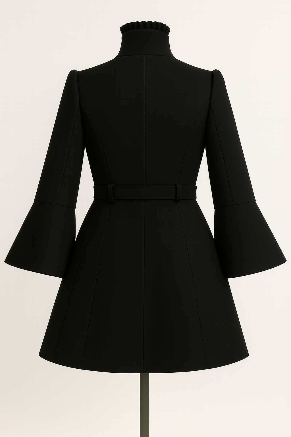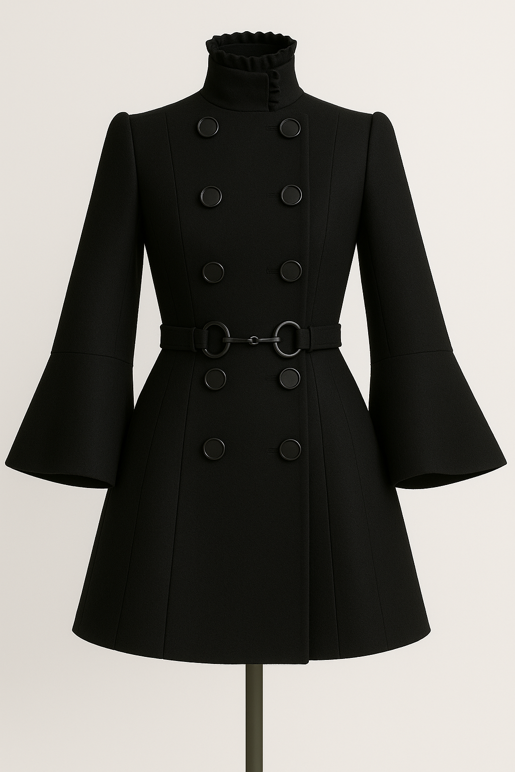 This striking mini coat dress boasts a high ruffled collar for a touch of Victorian elegance, paired with structured shoulders and long bell sleeves that flare at the cuffs. The double-breasted front features glossy black buttons, while a wide belt with metal rings accentuates the waist, creating a fitted silhouette that flows into a gentle A-line skirt. Crafted from smooth, matte fabric, it’s perfect for evening events or bold daytime looks, blending military precision with feminine flair for timeless sophistication.