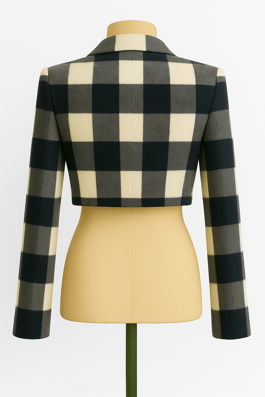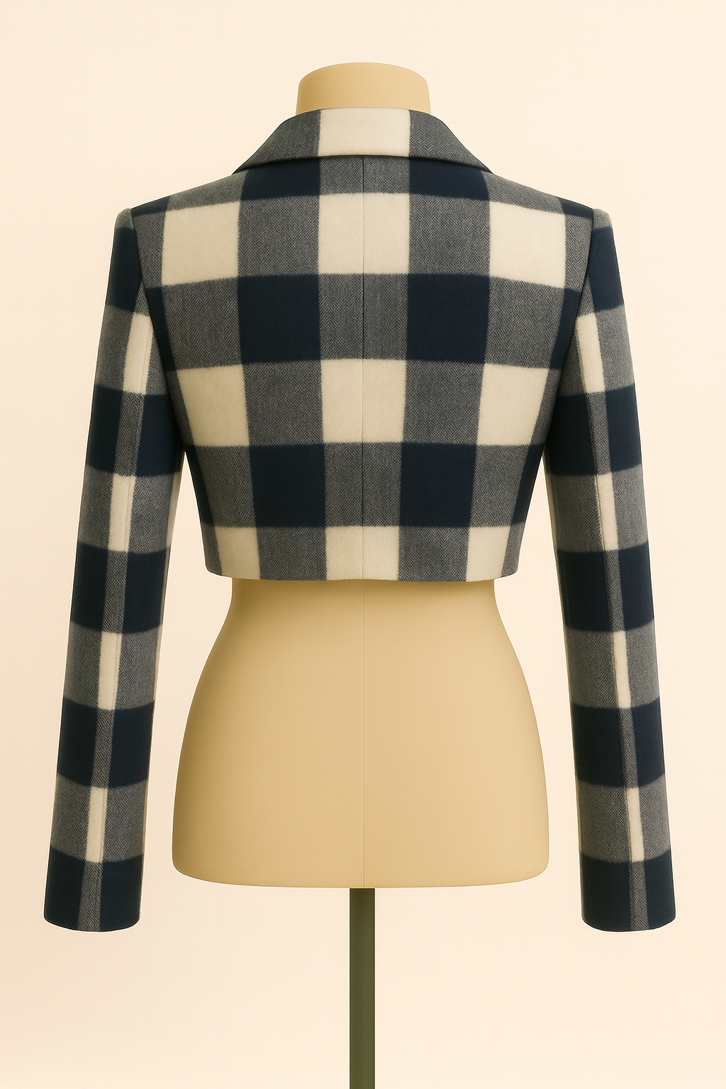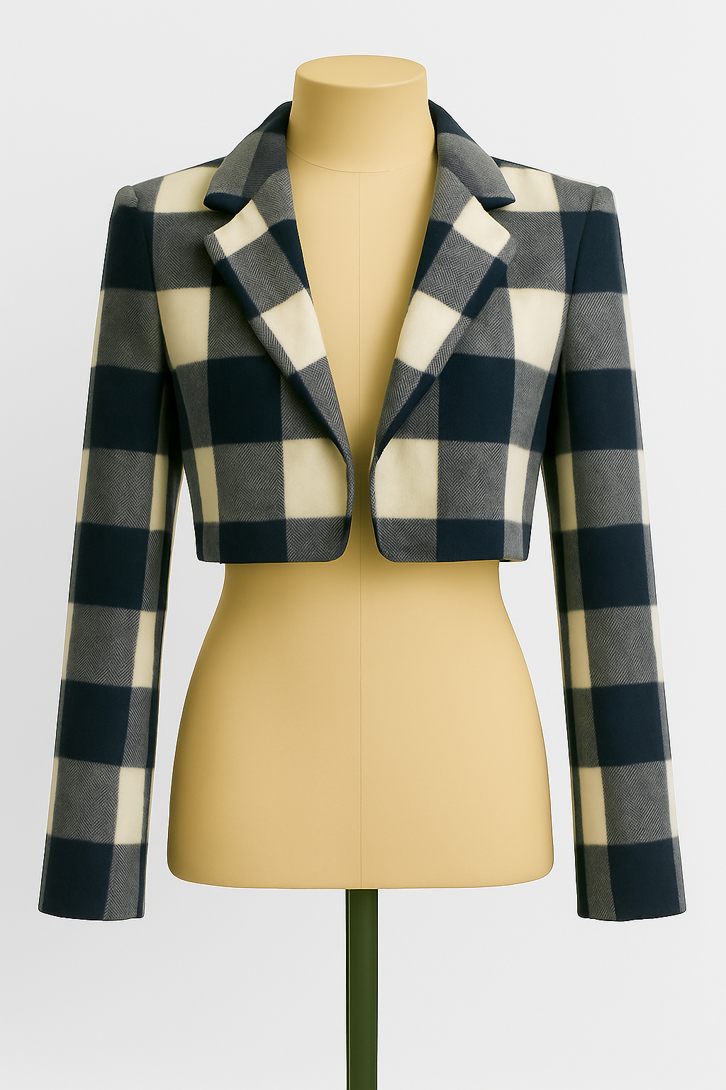 A stylish cropped jacket with a bold blueberry and cream checkered pattern, perfect for a chic, food-inspired look.