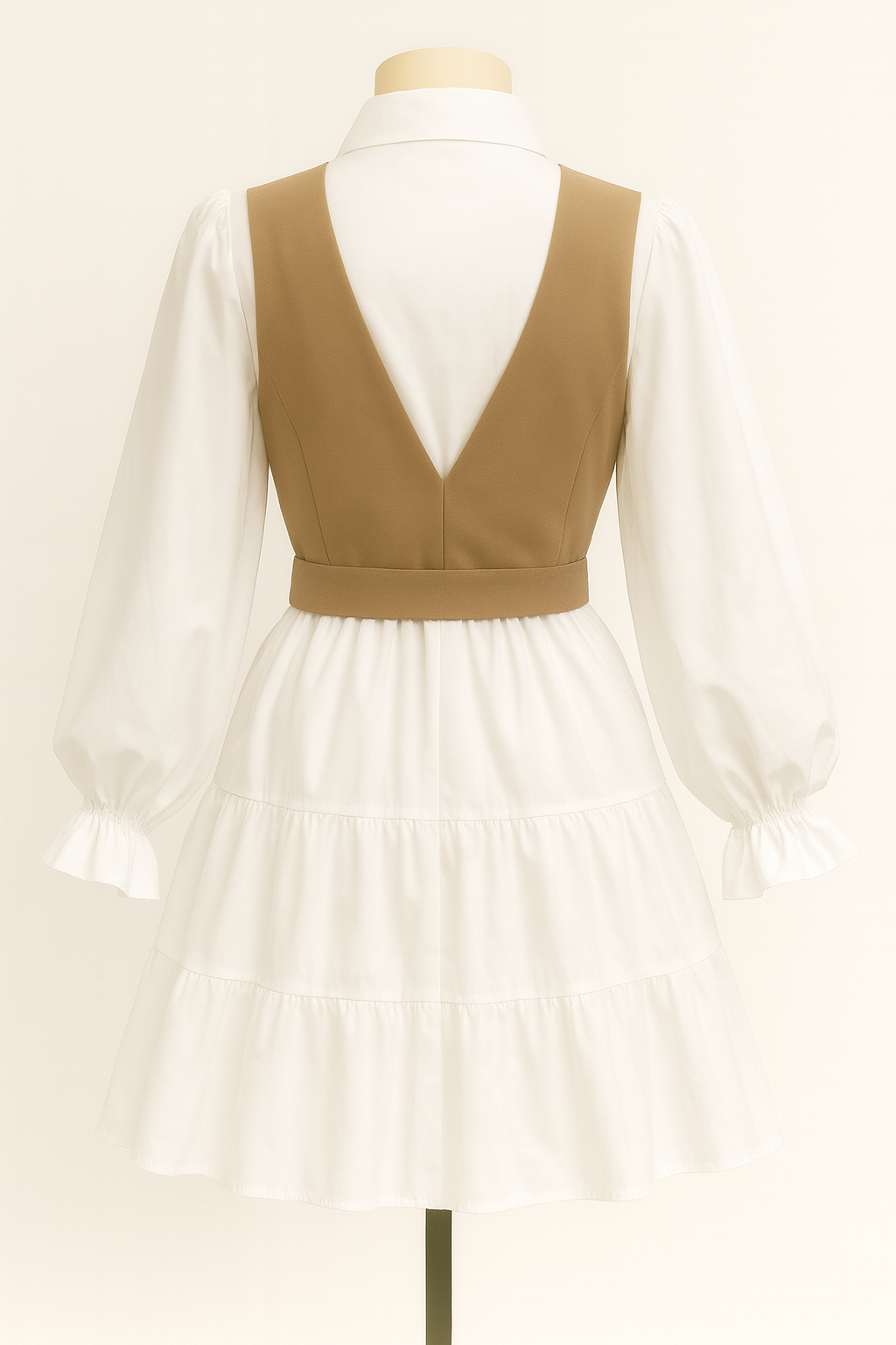 This charming ensemble features a white collared shirt dress with front buttons, voluminous puffed sleeves ending in ruffled cuffs, and a tiered skirt for added flirtation. Overlaid with a sleeveless tan vest boasting notched lapels, subtle buttons, and a long tie belt that crosses at the waist, it creates a balanced contrast. Ideal for brunch or office settings, it blends vintage femininity with modern tailoring, offering versatile comfort and elegant flair in neutral tones.
