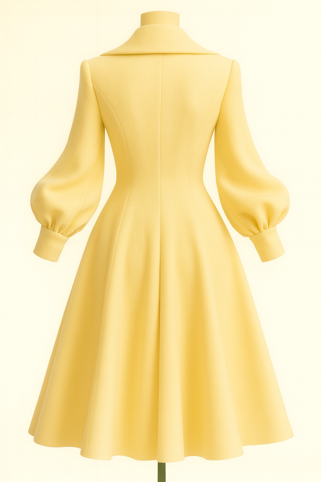 A fitted pale yellow coat dress with gold buttons, shawl collar, and puffed sleeves.