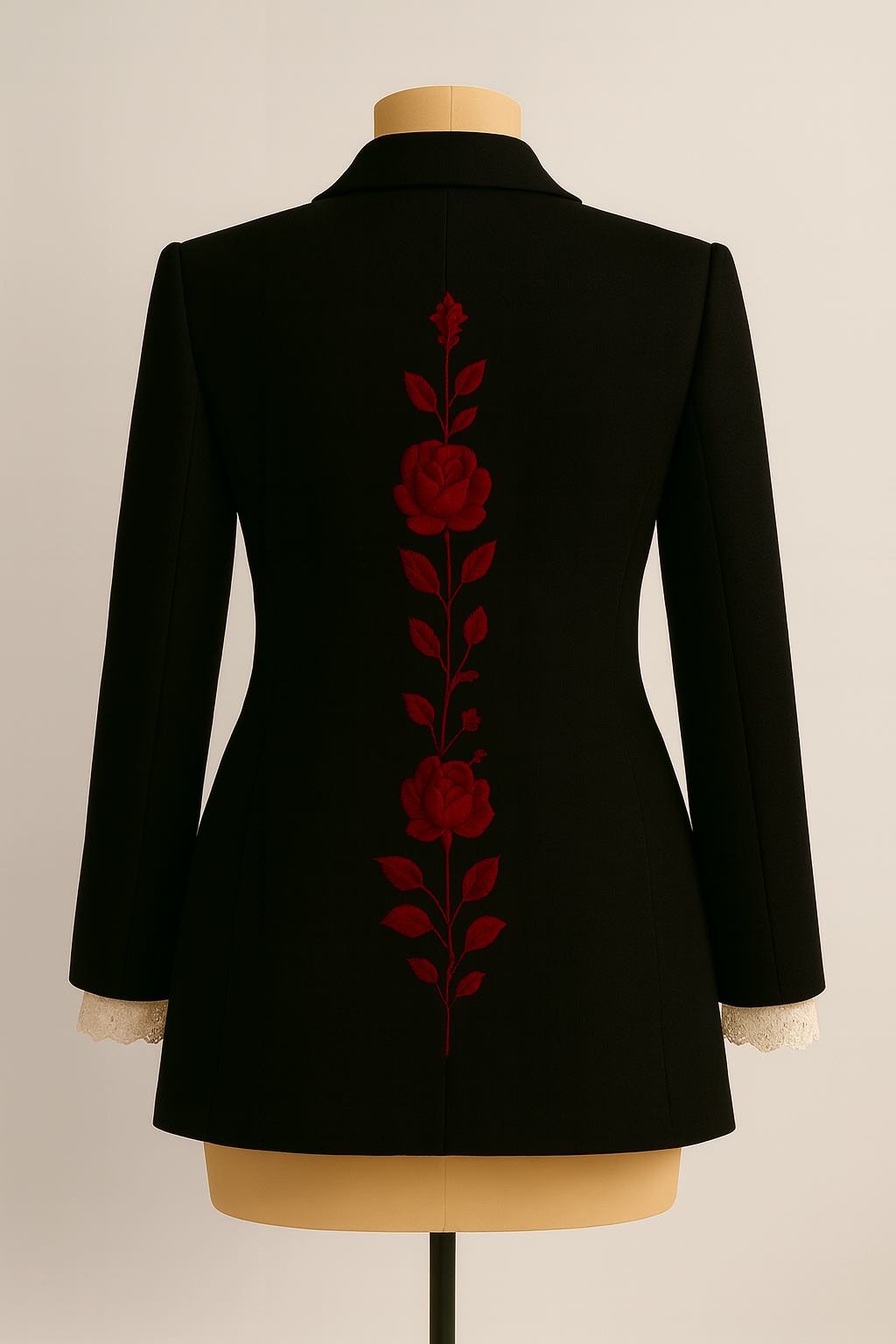 This elegant blazer features a rich black fabric adorned with vibrant red rose embroidery, reminiscent of cherry blossoms, paired with delicate lace cuffs for a refined touch.