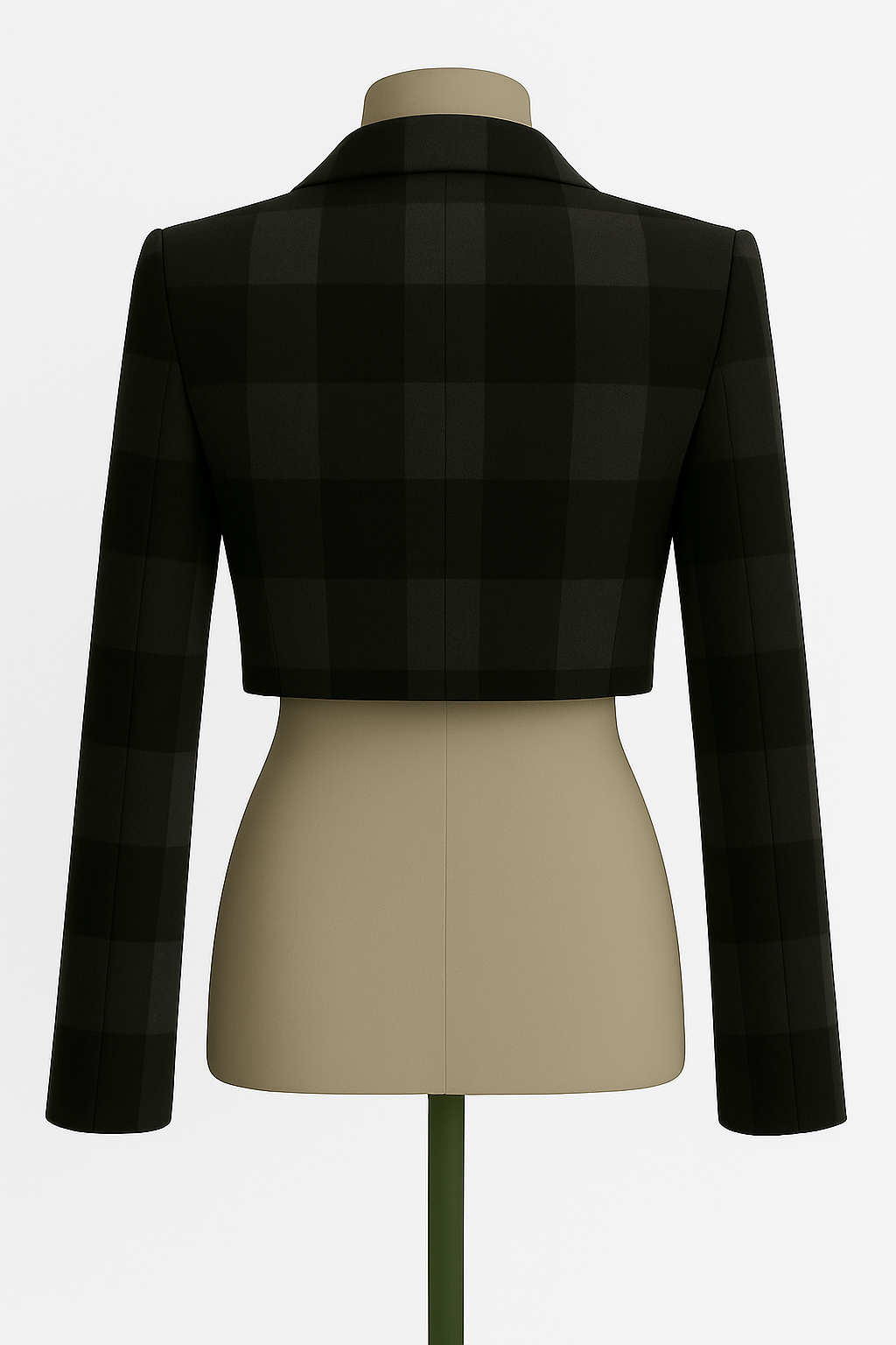 This stylish cropped blazer features a bold gingham pattern in black and gray tones, crafted from a textured wool-like fabric for added warmth. It includes long sleeves, notched lapels, and an open-front design without closures, cropping at the waist for a fitted, modern silhouette. Versatile for casual or semi-formal outfits, it adds a classic yet edgy sophistication to any wardrobe.