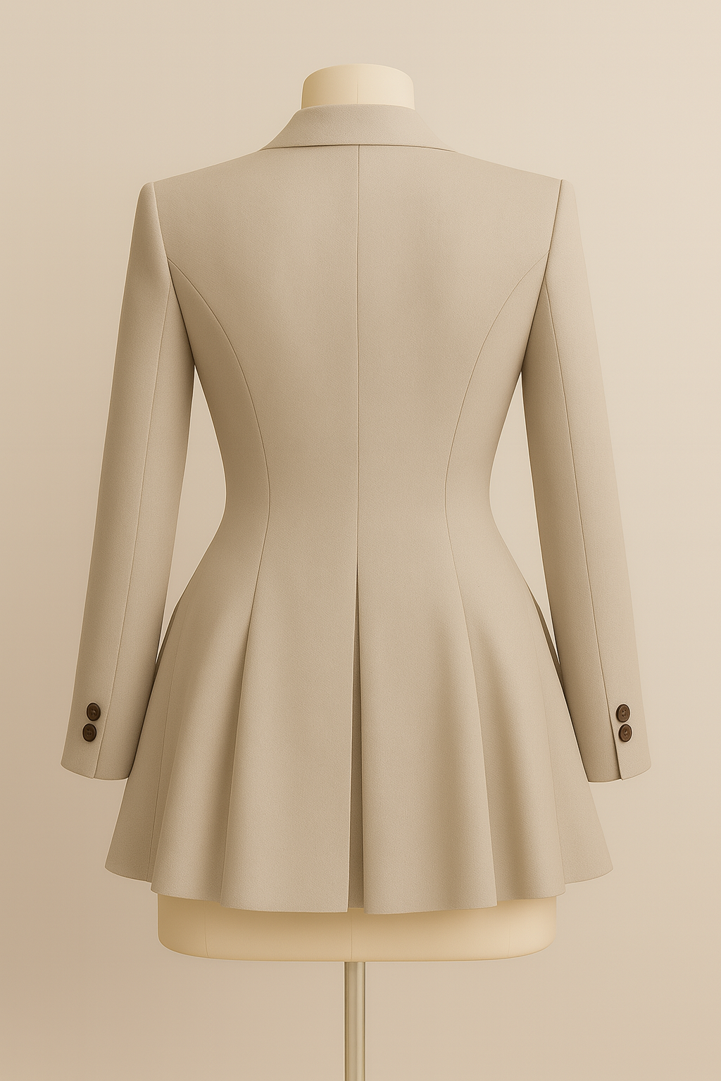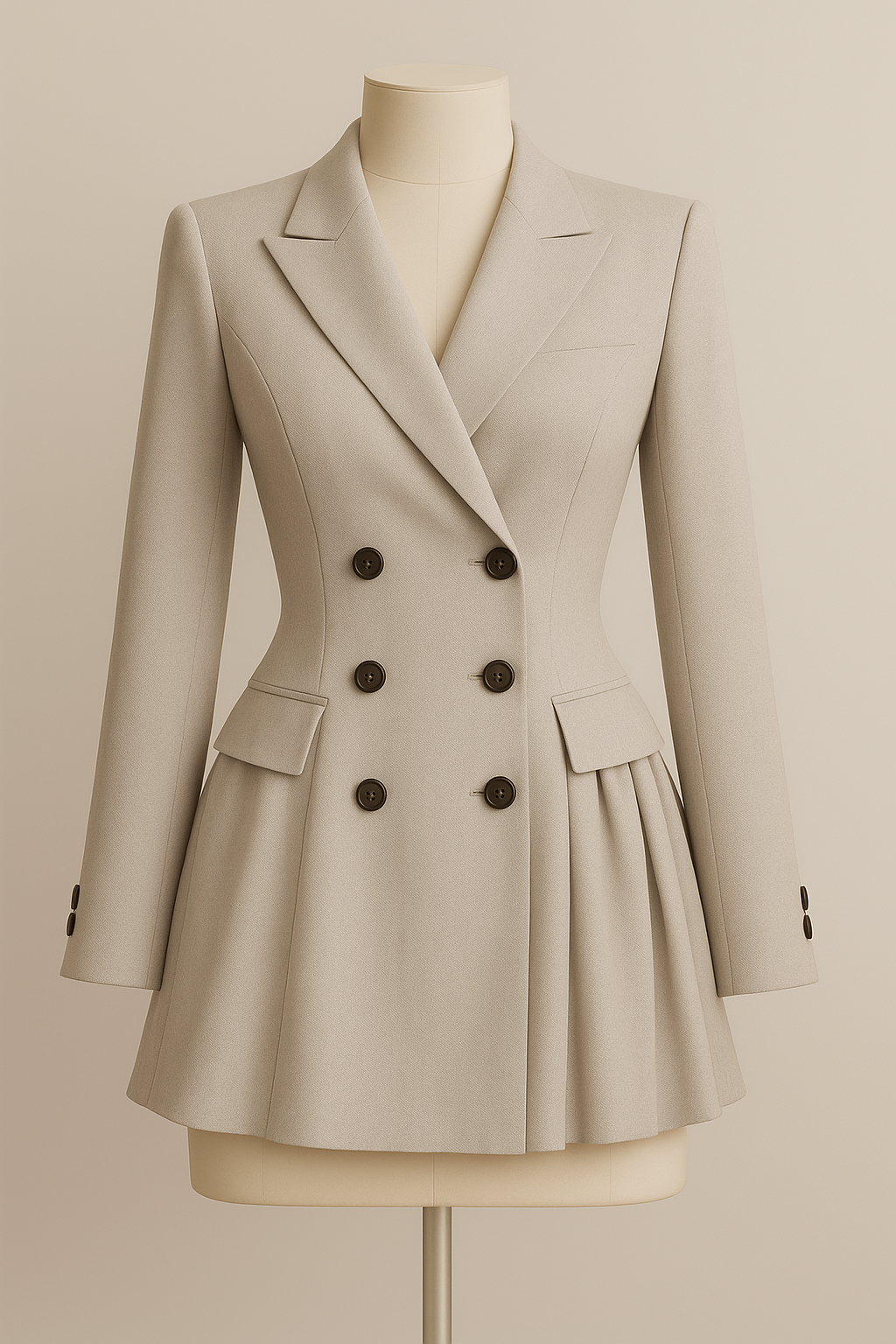 This elegant blazer dress showcases a smooth taupe fabric in a tailored fit, featuring peaked lapels and a double-breasted front with dark buttons for a classic touch. Long sleeves end in buttoned cuffs, while the cinched waist flows into a pleated peplum hem, adding feminine movement. The asymmetrical closure enhances its structured silhouette, blending professional poise with playful flair. Versatile for office or events, it exudes timeless sophistication in a mini length design.