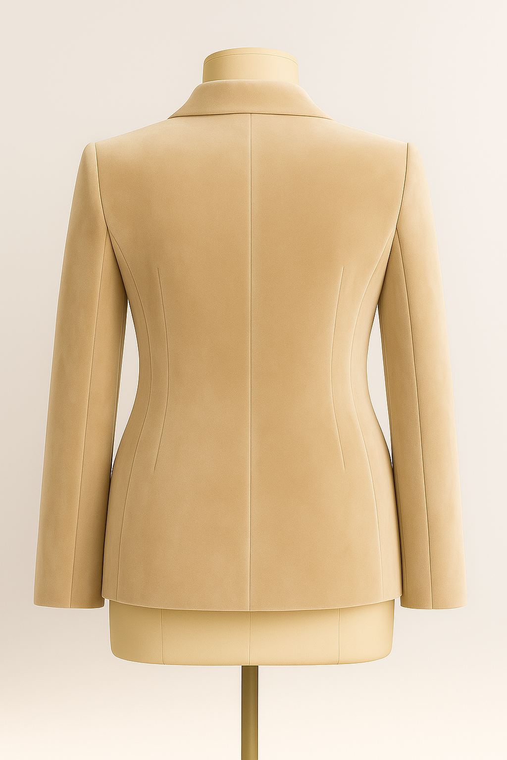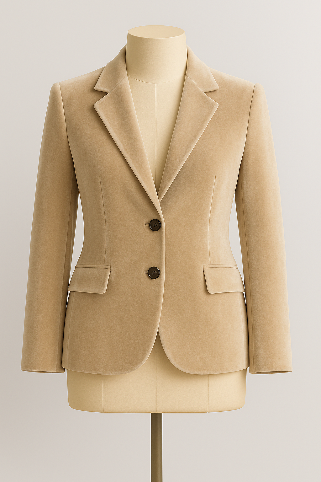This sophisticated beige blazer features a soft velvet texture, structured shoulders, and notched lapels for a classic tailored look. It includes long sleeves, flap pockets at the hips, and a two-button closure with dark contrasting buttons, creating a fitted silhouette that flatters the form. Versatile for both professional and casual settings, it adds a touch of luxury and warmth to any outfit, blending timeless elegance with subtle sheen.