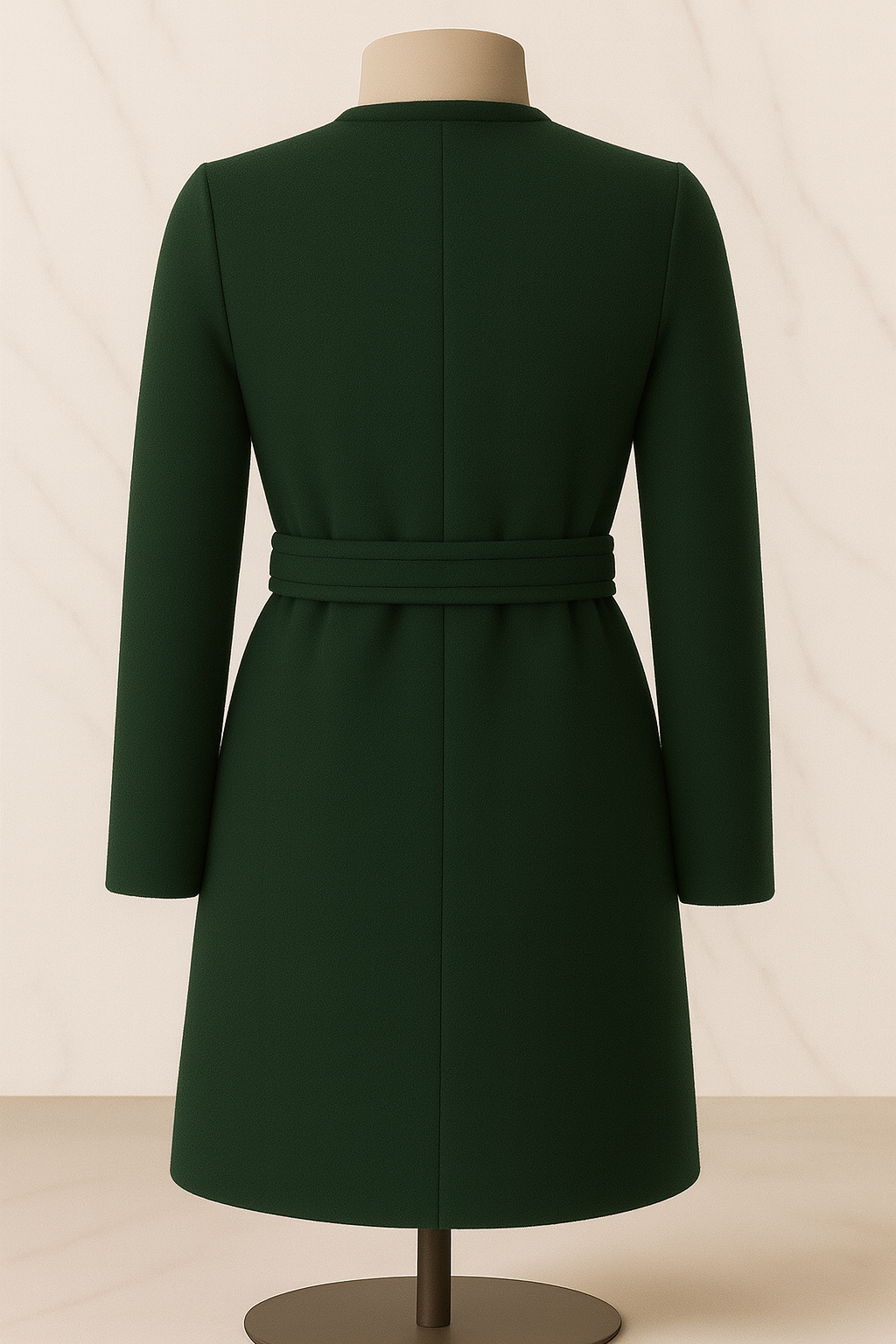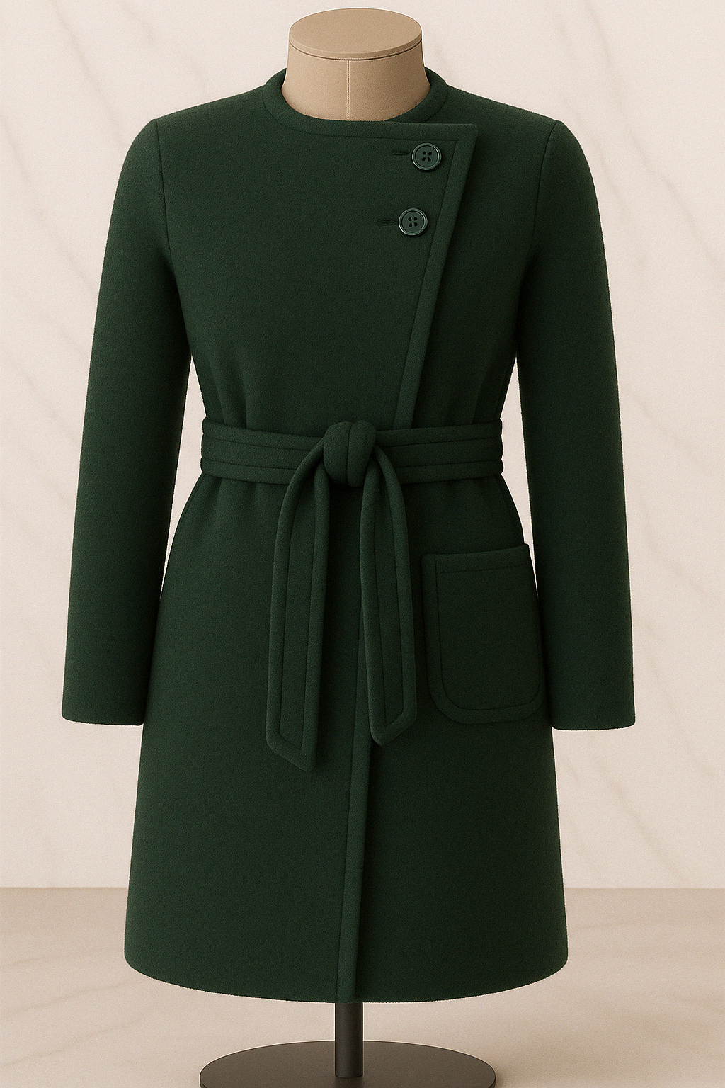 A deep forest green coat dress with asymmetrical button closure, self-tie belt, and patch pockets, blending structured tailoring with effortless grace.