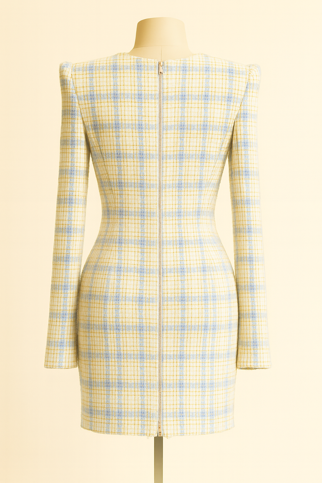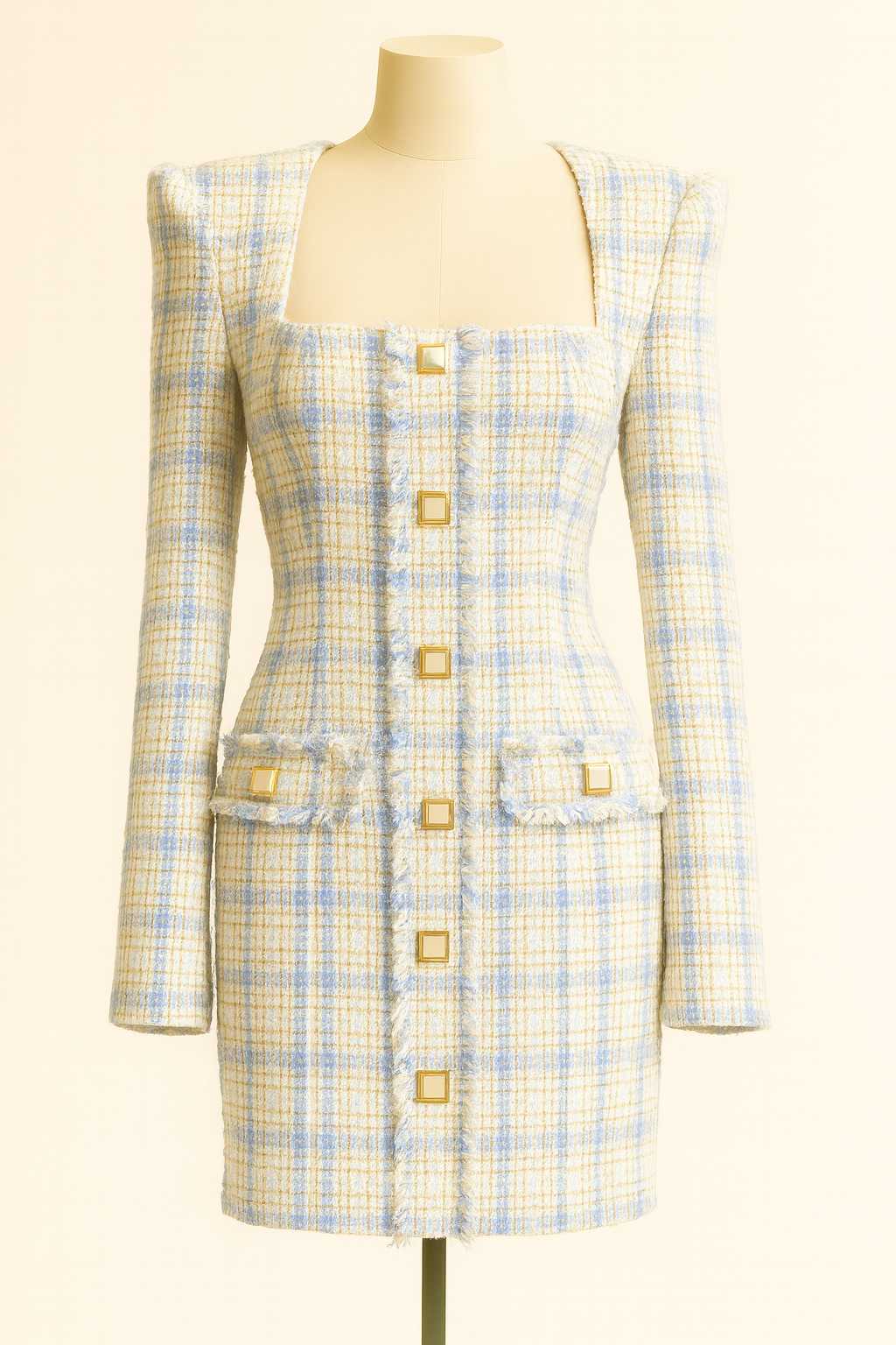 Cream Swirl radiates freshness and elegance with its soft plaid in shades of blue and cream. The structured shoulders and fitted silhouette add modern strength, while the gold square buttons bring a touch of luxury. Frayed trim along the pockets and edges softens the sharp tailoring, evoking the delicate beauty of wild cornflowers against a creamy backdrop. Chic yet playful, this dress is perfect for moments where sophistication meets charm.