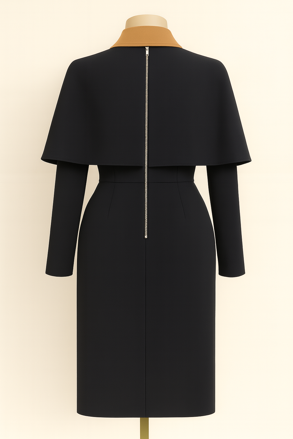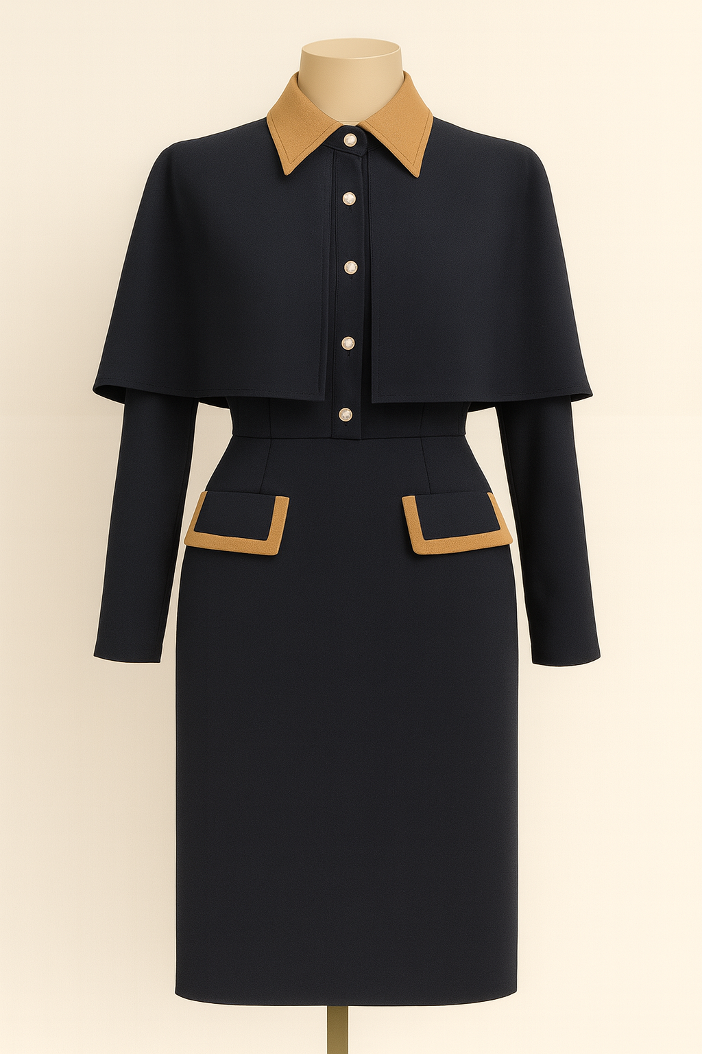 This sophisticated midi dress features a deep navy body with long fitted sleeves and a structured pencil skirt, accented by contrasting gold trim on the pointed collar and square pocket flaps for a touch of elegance. The attached short cape adds dramatic shoulder coverage, while pearl buttons run down the front for a polished finish. Crafted from smooth fabric, it’s ideal for professional or semi-formal occasions, blending vintage military inspiration with modern minimalism for versatile styling.