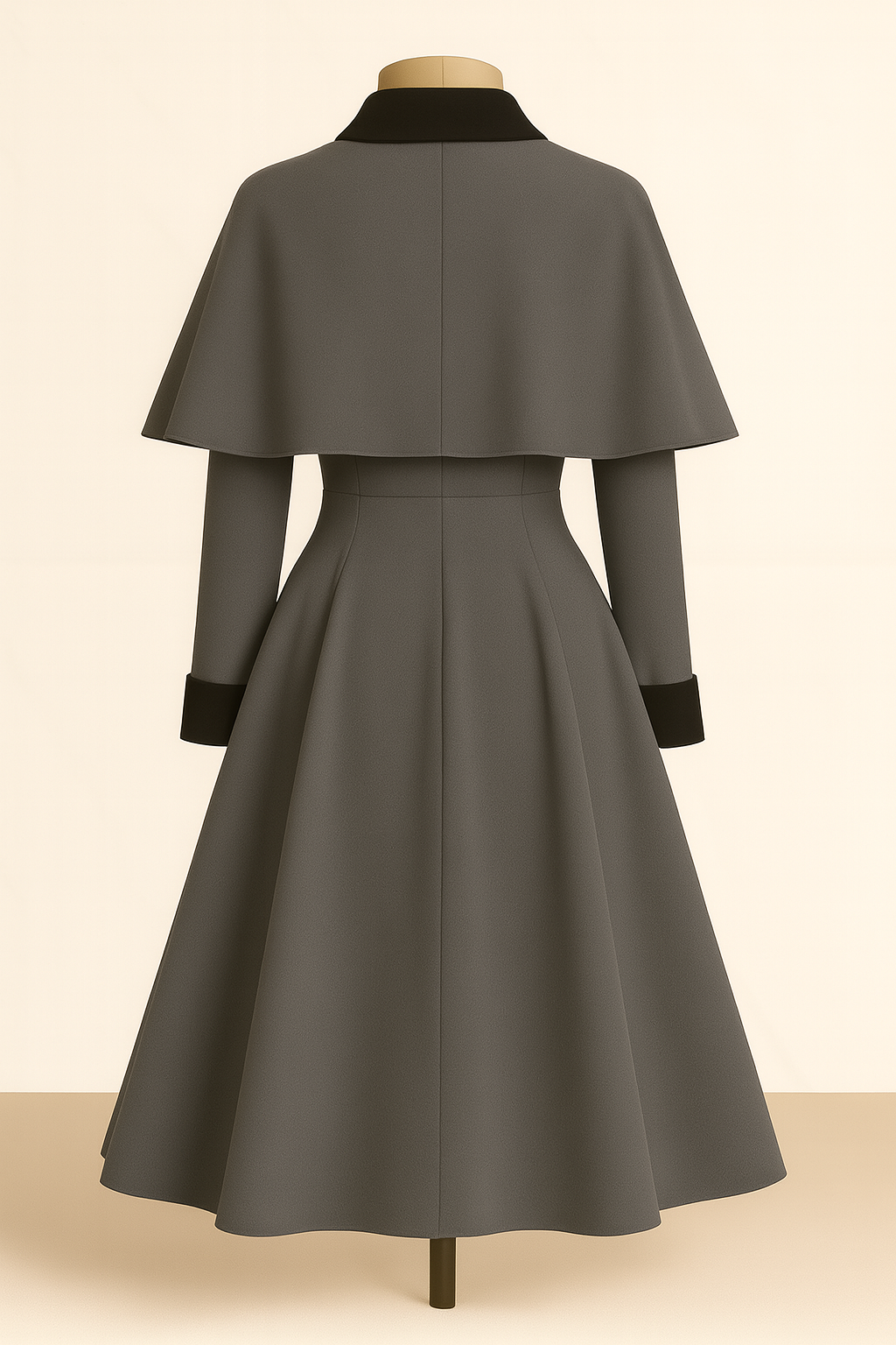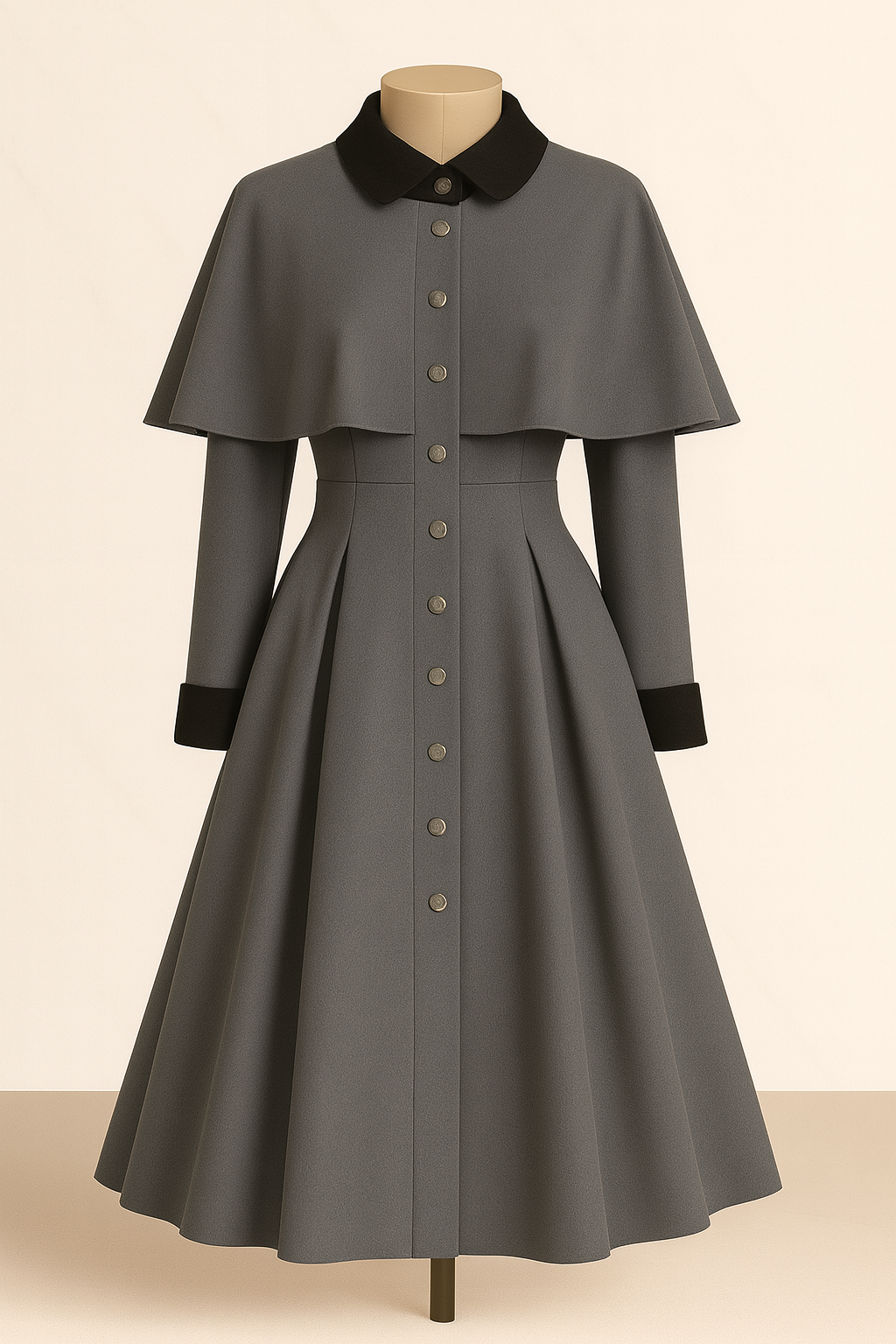 A refined grey coat with a cape overlay, evoking quiet strength and earthy elegance.