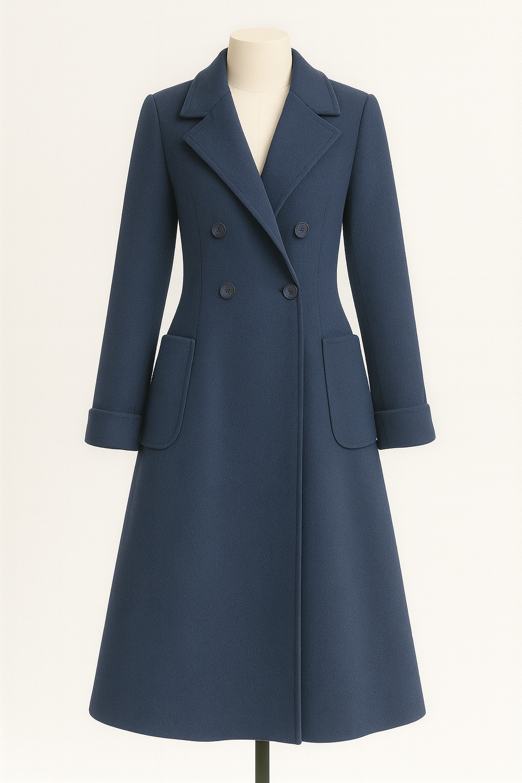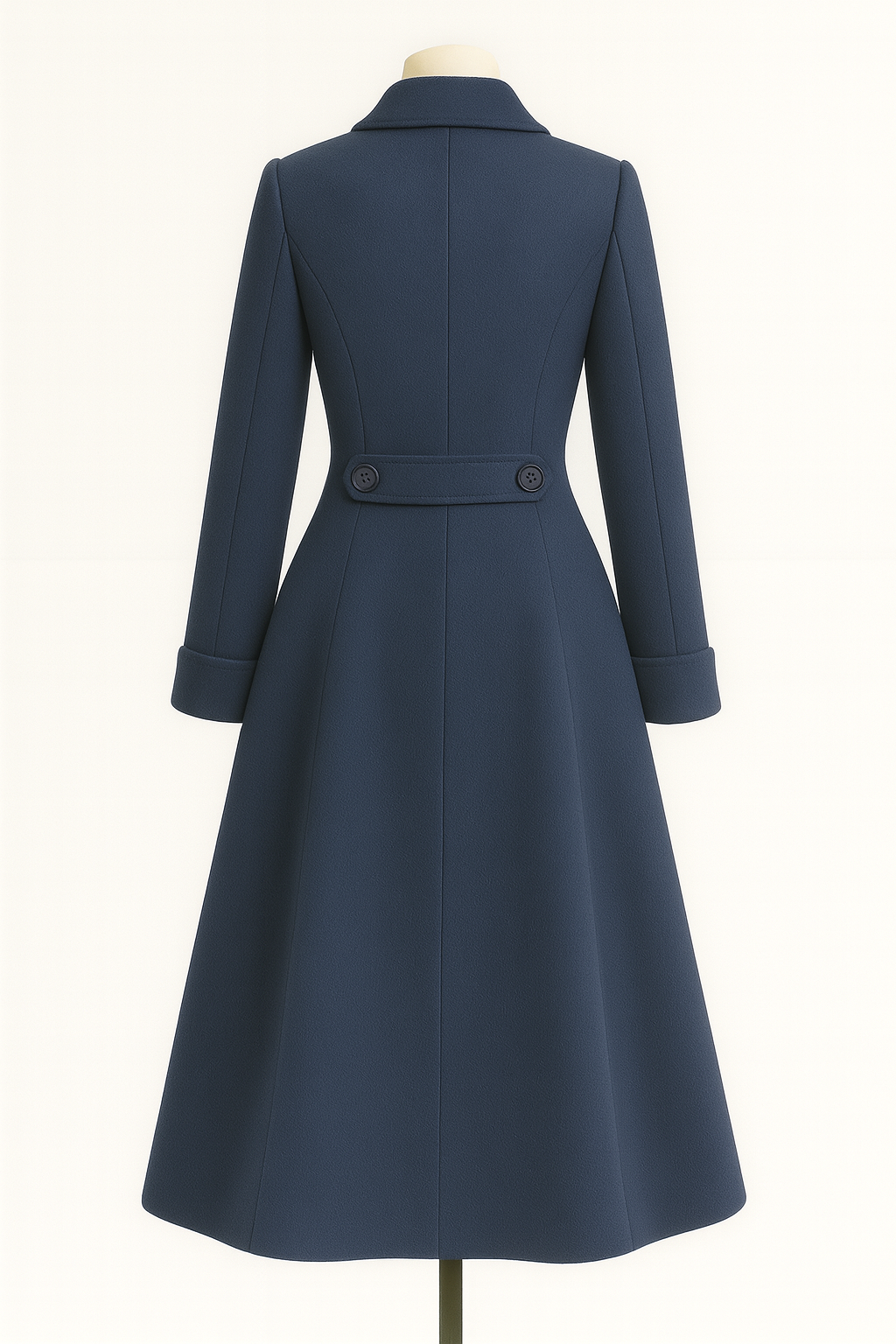 Dark Evening draws inspiration from the stillness of a forest at night. Its rich navy tone mirrors the depth of pine shadows beneath moonlight, while the double-breasted design and structured tailoring bring elegance and strength. Wide lapels and cuffed sleeves add sophistication, balanced by the graceful flare of the hem. Both commanding and refined, this coat offers timeless style, making it a versatile piece for evenings out or polished daytime looks.