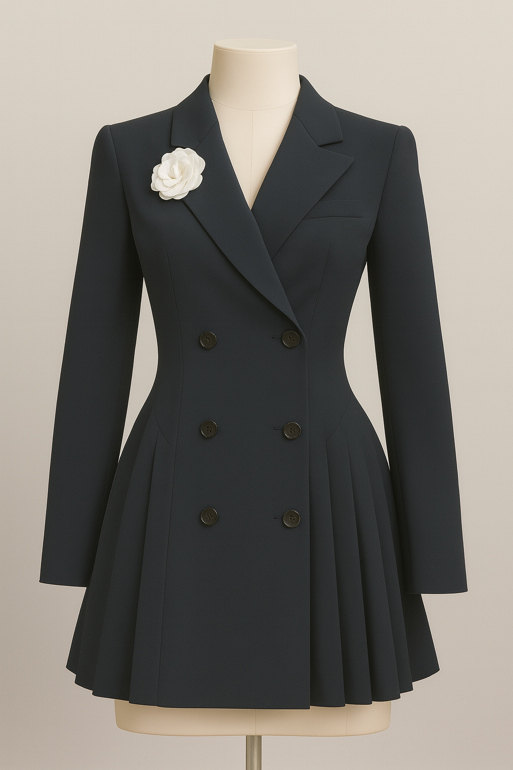 A sleek black blazer dress with a fitted bodice, double-breasted buttons, pleated skirt, and a white camellia brooch for elegant contrast.