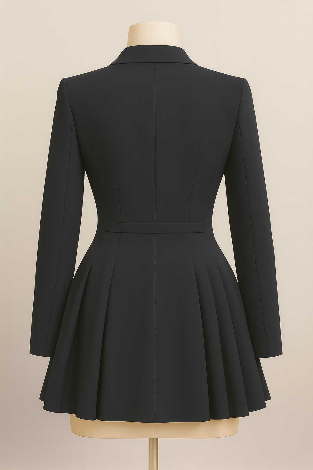 This exquisite ebony camellia outfit embodies timeless sophistication, featuring a tailored double-breasted blazer in deep black wool that cinches at the waist before flaring into soft, knife-pleated skirts for a feminine peplum silhouette. The pristine white camellia brooch on the lapel adds a natural, floral touch, evoking blooming petals against a midnight sky. Ideal for formal events or professional attire, it blends structured tailoring with graceful movement, offering versatility and poise in every step.