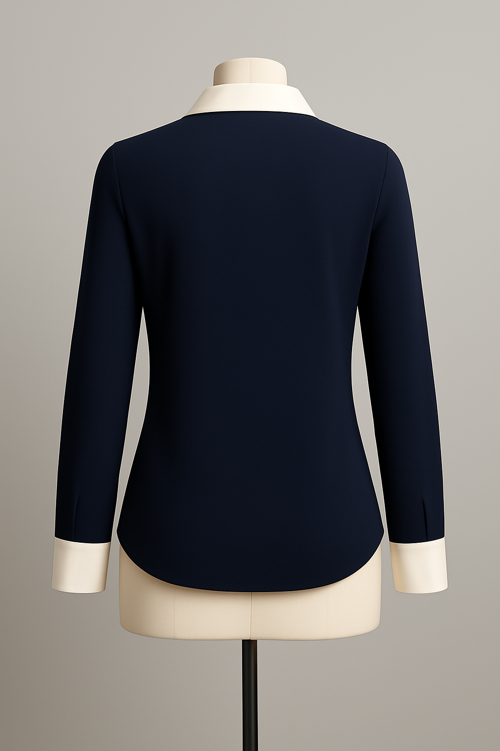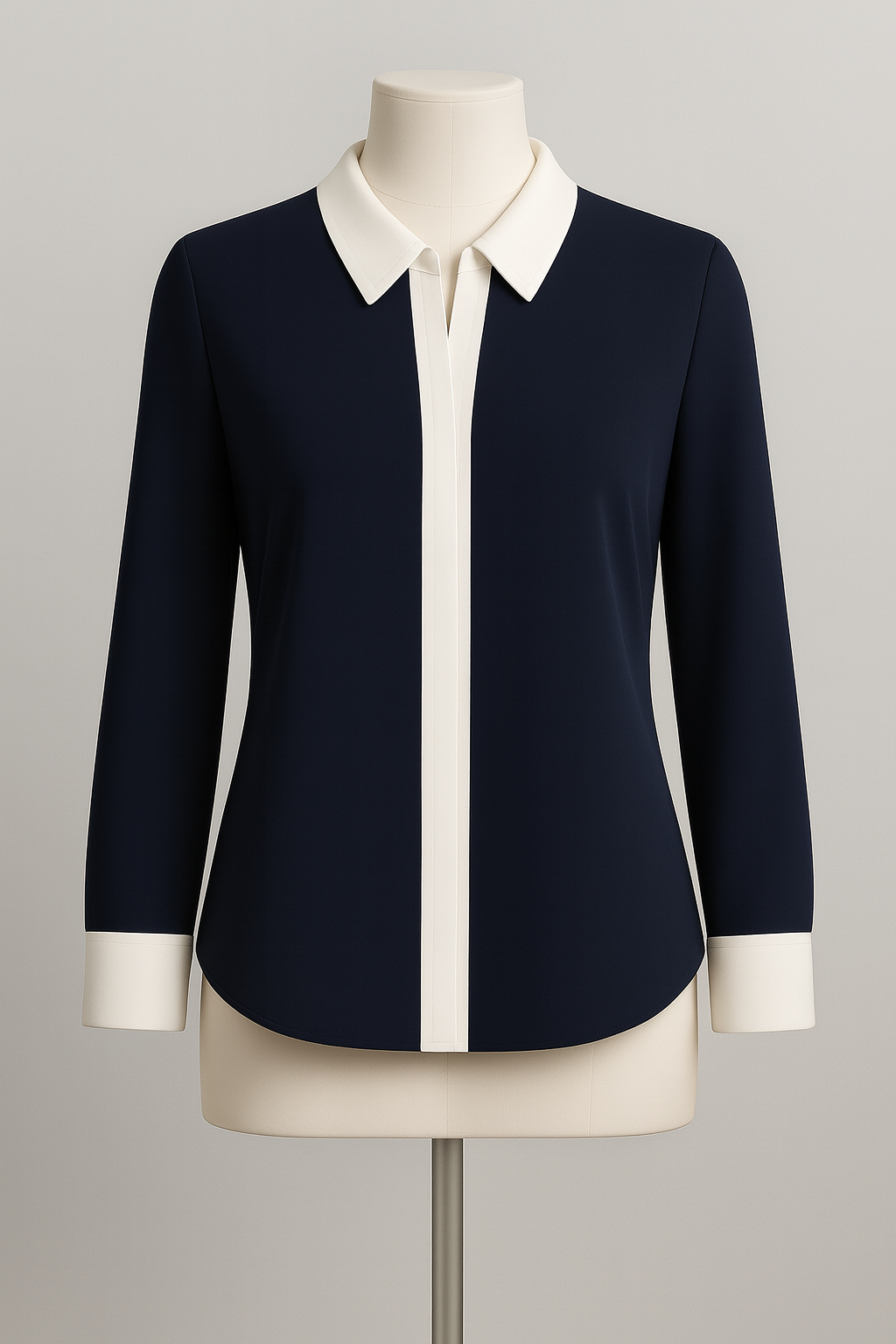 Channel refined minimalism in the Navy Eclipse Blouse, where deep navy fabric forms a tailored silhouette with seamless construction and a hint of stretch for comfort. The bright white collar folds neatly over a V-shaped placket stripe, creating a striking vertical contrast that elongates the figure. Long sleeves end in crisp white cuffs, adding a touch of formality. Versatile for office settings or casual pairings, this piece offers timeless sophistication with a modern twist, perfect for layering or standalone wear in any season.