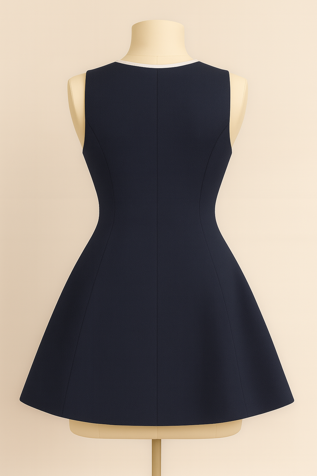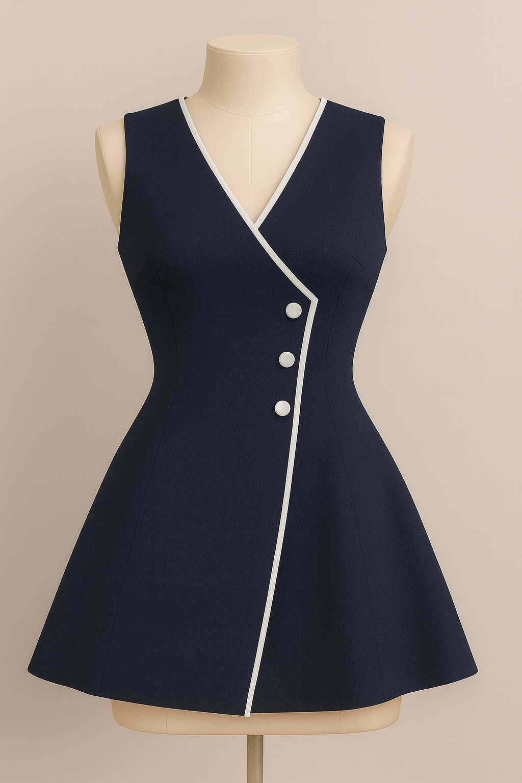 A sleeveless navy A-line dress with crisp white piping and offset buttons, channeling retro mod elegance.