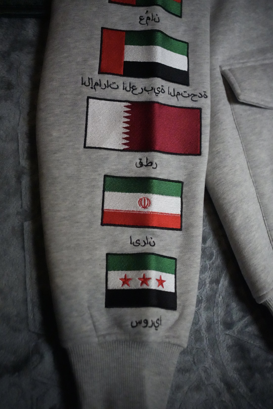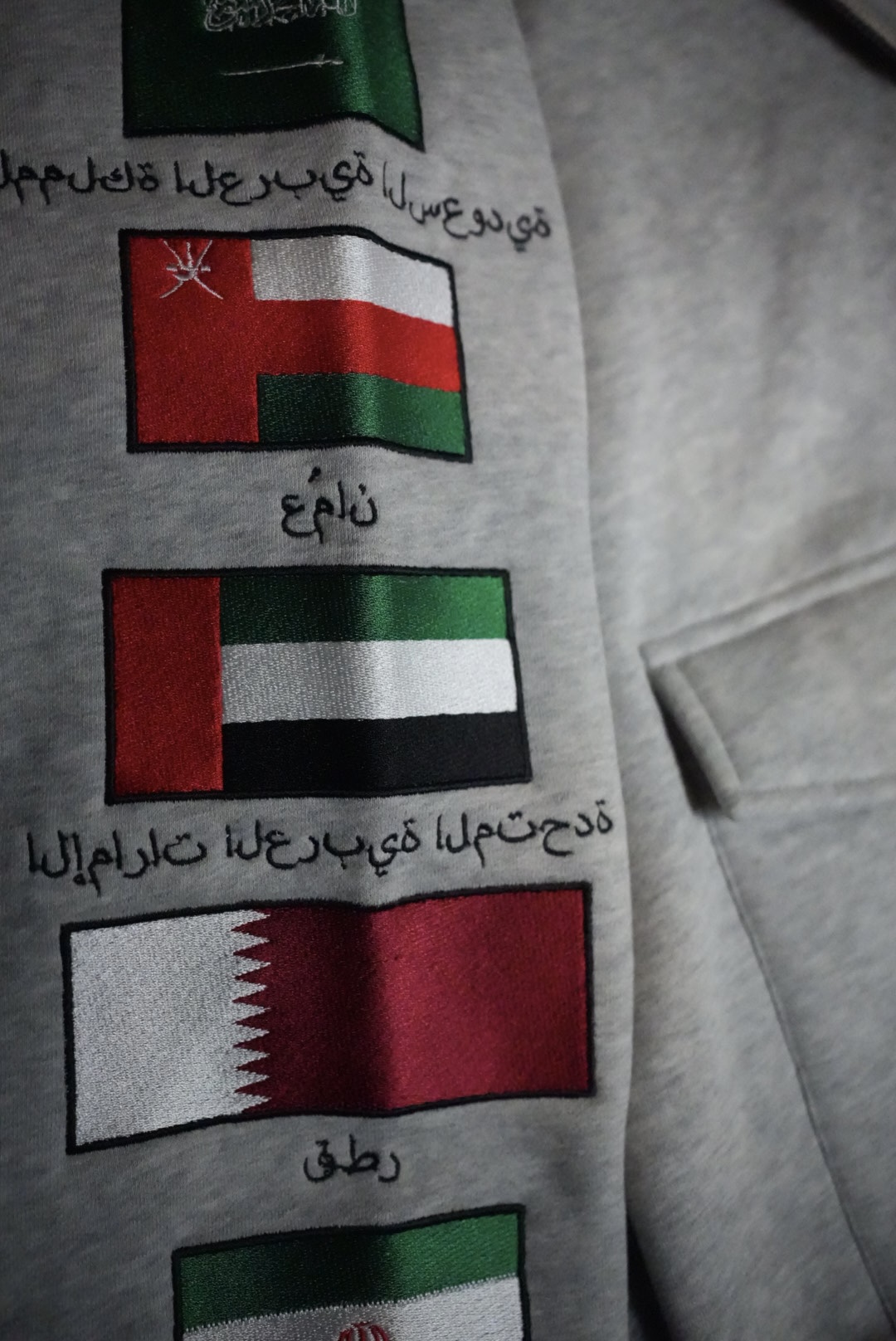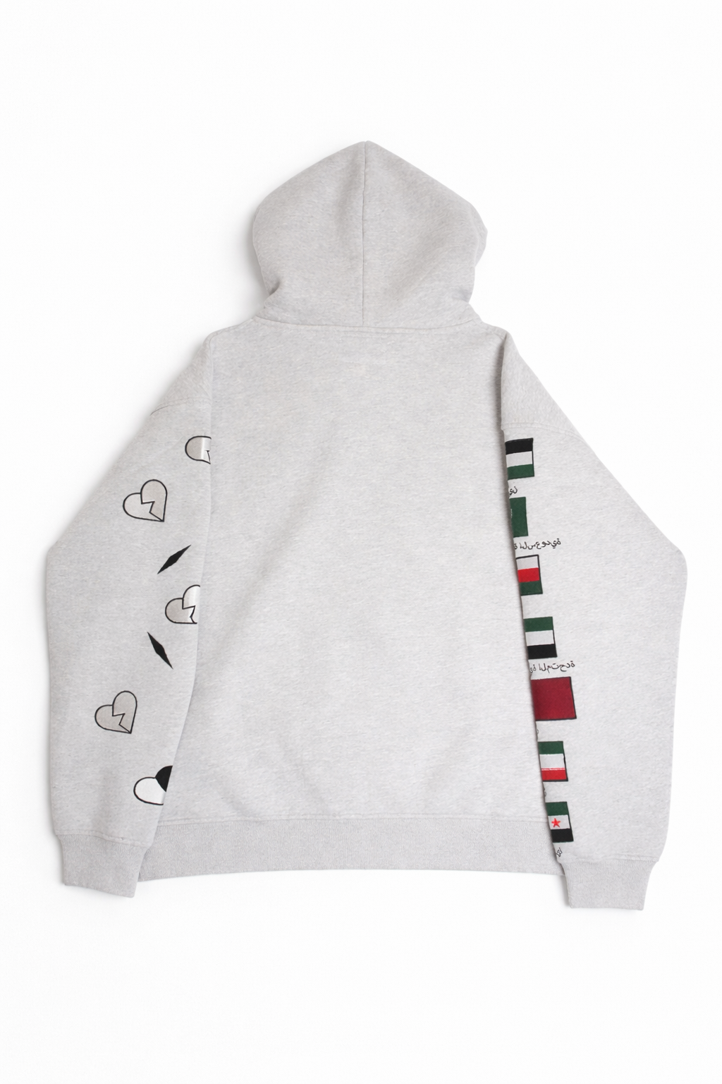This luxurious oversized zip-up hoodie comes in a soft, neutral light grey shade that gives it a relaxed, premium feel. Crafted from a durable yet comfortable 80% cotton and 20% polyester blend, it offers breathability with added structure for longevity. Cut generously for an intentionally baggy, streetwear-inspired silhouette, it features intricate embroidery along one sleeve showcasing the flags and Arabic country names of seven nations: Palestine (starting with its flag and “فلسطين”), Saudi Arabia, Oman, UAE, Qatar, Iran, and Syria. The opposite sleeve adds a playful touch with a signature scattered black-and-white heart motifs, while practical details like a full zip front, hood, and patch pockets complete this bold, culturally expressive piece.