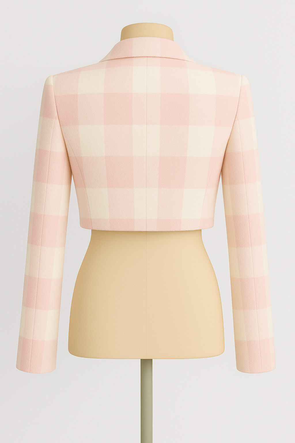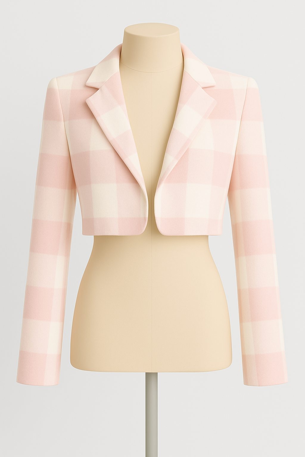 This fashionable cropped blazer showcases a large-scale gingham pattern in soft pink and cream tones, crafted from a textured, wool-like fabric for a cozy feel. It features long sleeves, notched lapels, and an open-front design without visible closures, ending at the waist for a modern, fitted silhouette. Ideal for casual or dressed-up looks, it adds a playful yet sophisticated touch to any ensemble.