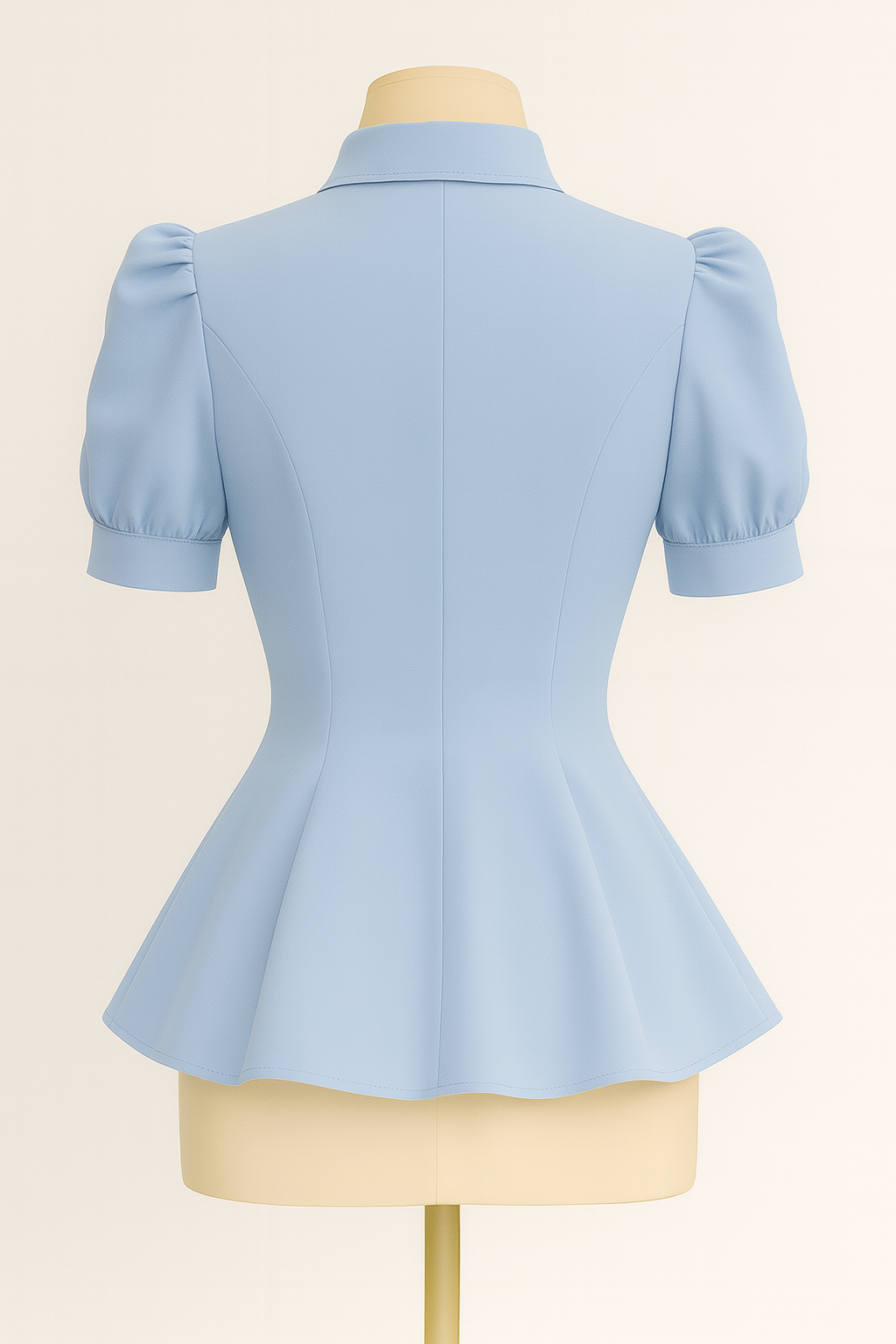 A delightful light blue blouse with puffed short sleeves, a oversized bow collar, button-front closure, and a flared peplum waist for a feminine silhouette.