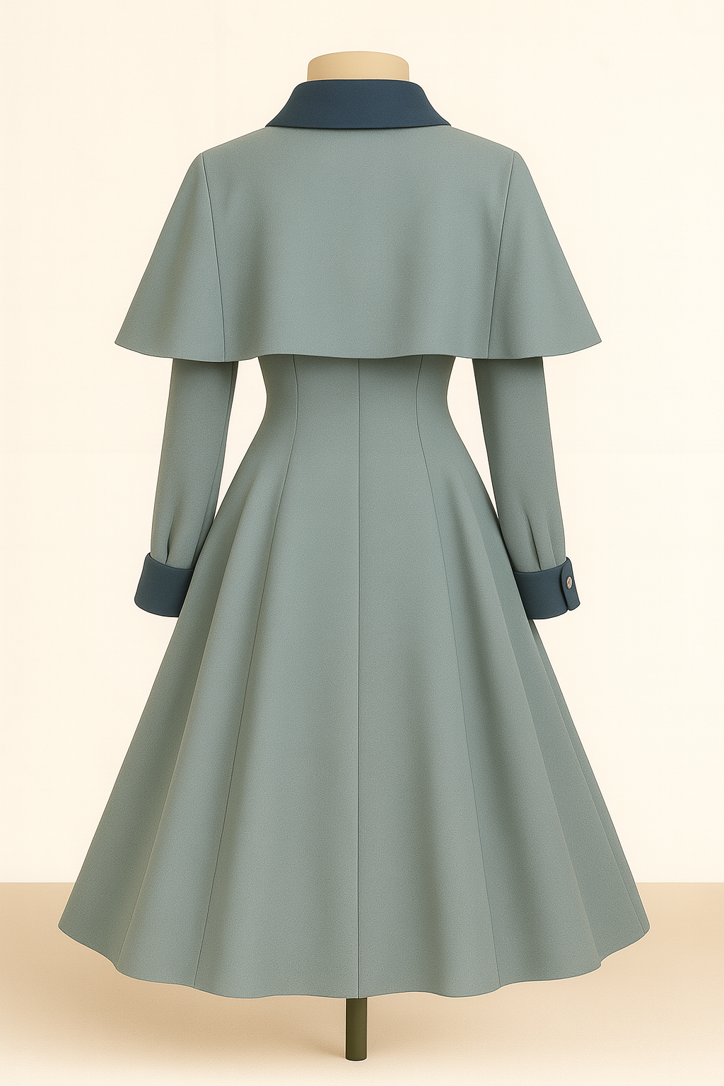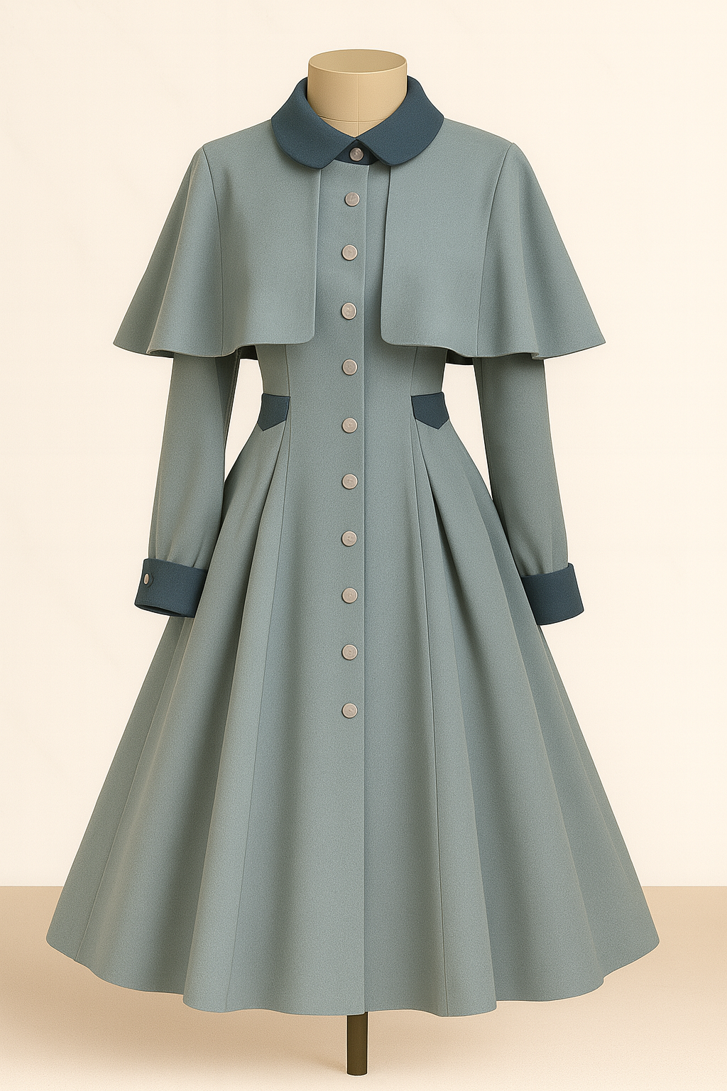 An elegant light teal dress with contrasting dark collar and cuffs, integrated capelet shoulders, button-front closure, and a fitted bodice flaring into a full skirt for vintage charm.