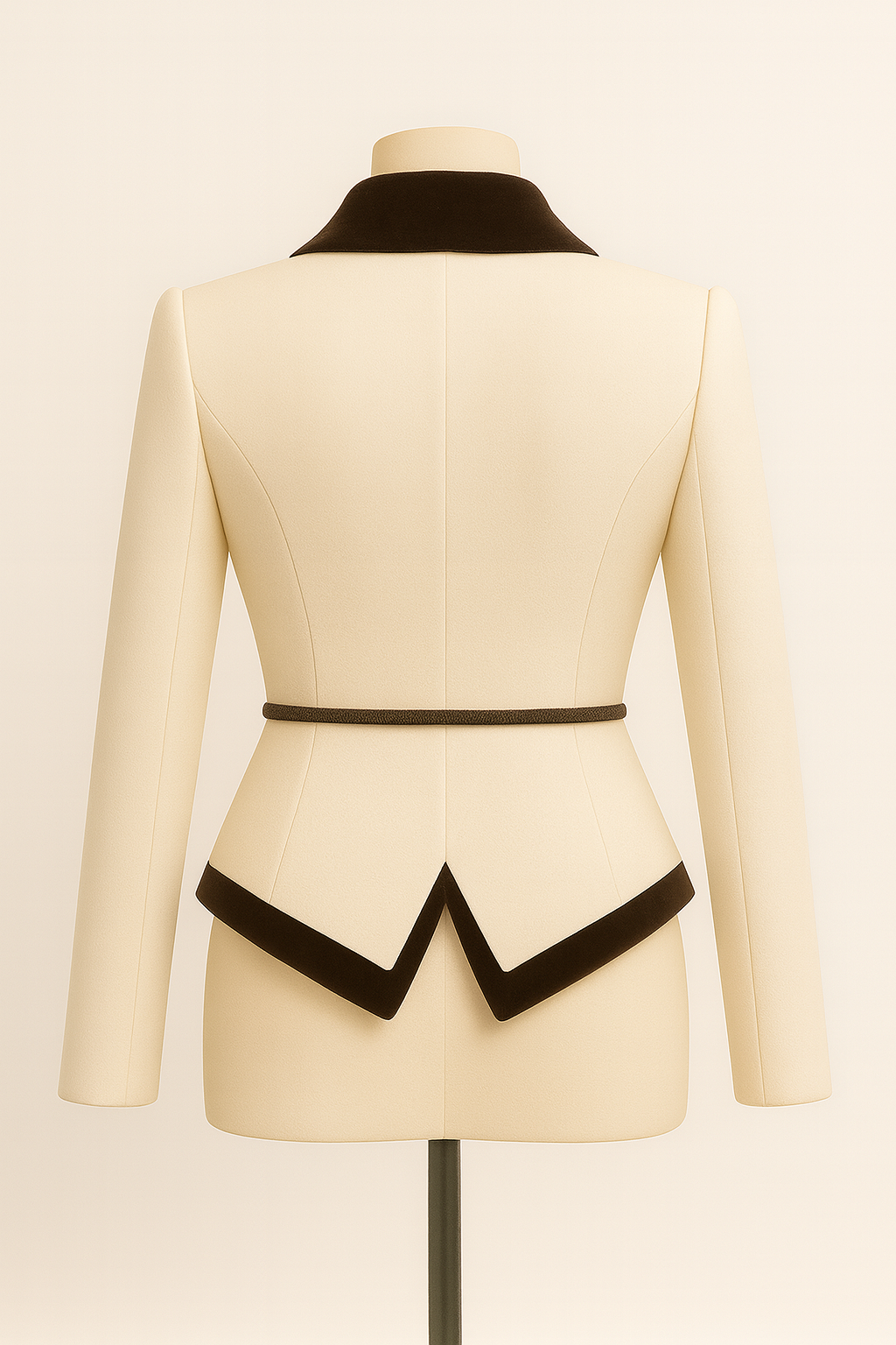 This elegant jacket features a creamy vanilla base with rich cocoa trim, blending natural tones into a sophisticated design.