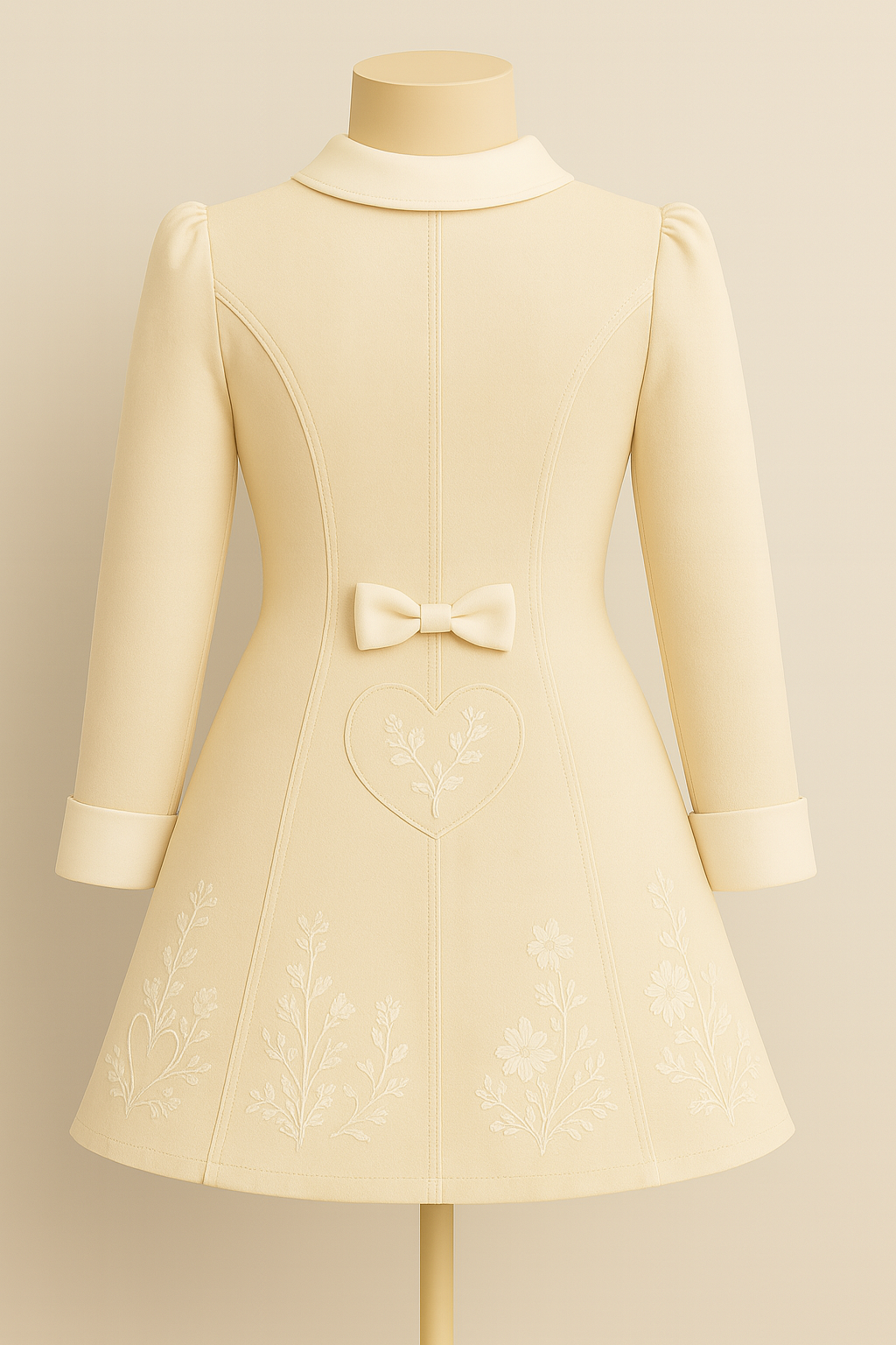 An elegant cream dress with a white collar and cuffs, featuring heart-shaped pockets with floral embroidery, small bows, and white buttons.